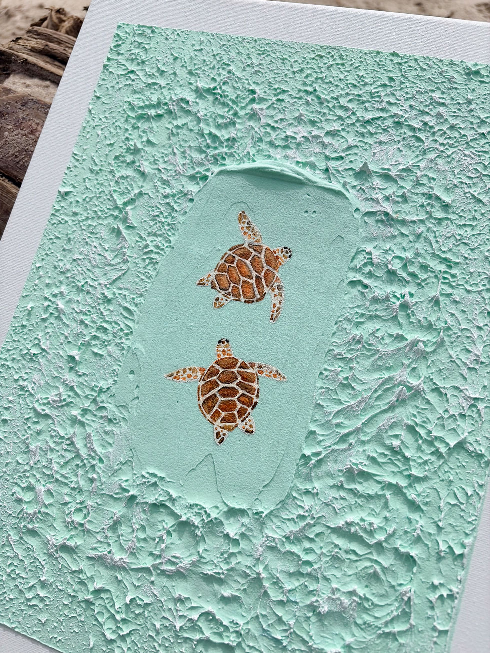 sea green paint tinted textured paste in a water texture effect with painted sea turtle friends in a swish